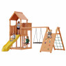 Игровая площадка изготовлена из клееного соснового бруса и массива сосны .Дерево обработано безопасной декоративно-защитной пропиткой. Технология значительно увеличивает срок службы конструкций, повышает прочность древесины, защищает её от гниения и грибков.
