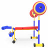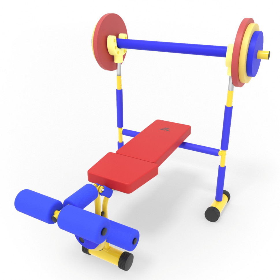 Скамья для домашних детских тренировок с усиленной конструкцией. Скамья легко собирается и транспортируется, а весовые гантели не требуют наполнения водой. Основание из высокопрочного профиля выдерживает активные нагрузки до 70 кг. Скамья безопасна и подходит даже для самостоятельных тренировок детям 4-8 лет. Скамья продается в комплекте со штангой и 8 весовыми пластинами разной массы. Поднятия штанги и жим ногами на специализированной детской скамье укрепляет мышечный корсет и развивает выносливость ребенка.